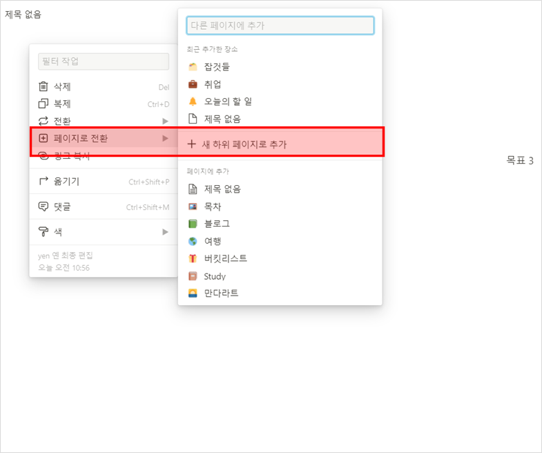 [페이지로 전환]-[새 하위 페이지로 추가]를 순서대로 클릭합니다.